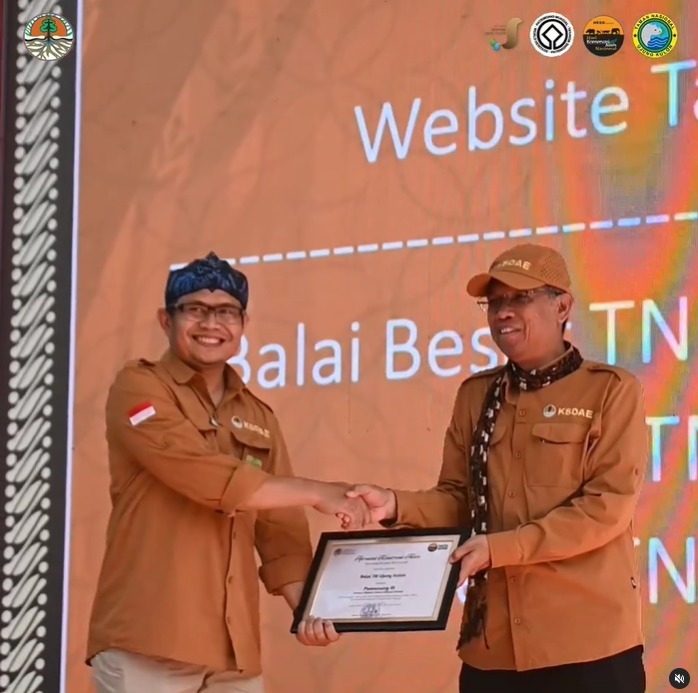 Balai Taman Nasional Ujung Kulon menerima penghargaan apresiasi sebagai taman nasional dengan website terbaik ke-tiga dalam peringatan Hari Konservasi Alam Nasional dua ribu dua puluh empat.