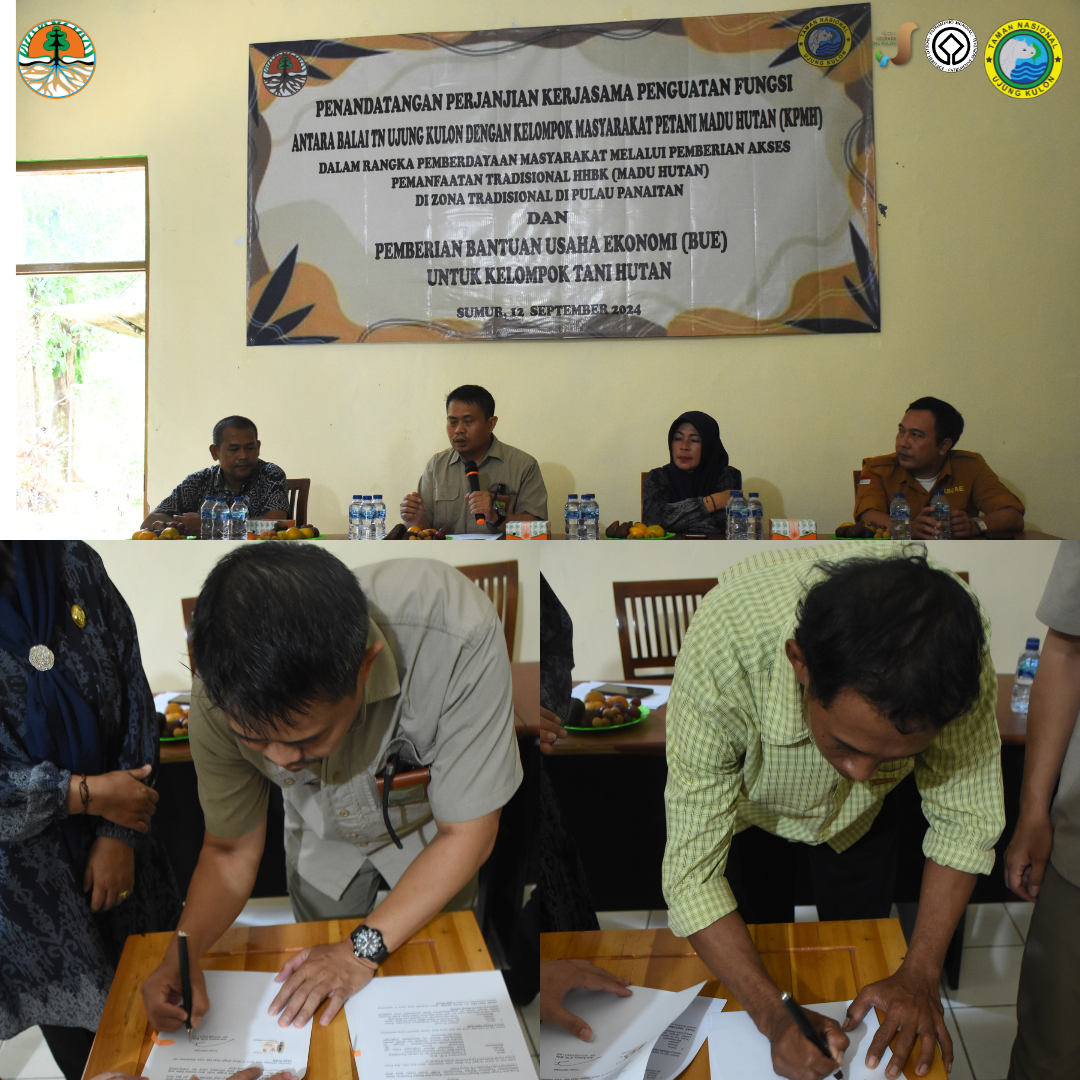 Pada Kamis, 12 September 2024 bertempat di Kantor SPTN Wilayah III Sumur telah dilaksanakan penandatangan Perjanjian Kerjasama Penguatan Fungi antara Balai TN Ujung Kulon dengan 8 (delapan) KPMH dalam rangka pemberdayaan masyarakat melalui pemberian akses pemanfataan tradisional Hasil Hutan Bukan Kayu (HHBK) Madu Hutan di zona tradisional di Pulau Panaitan.