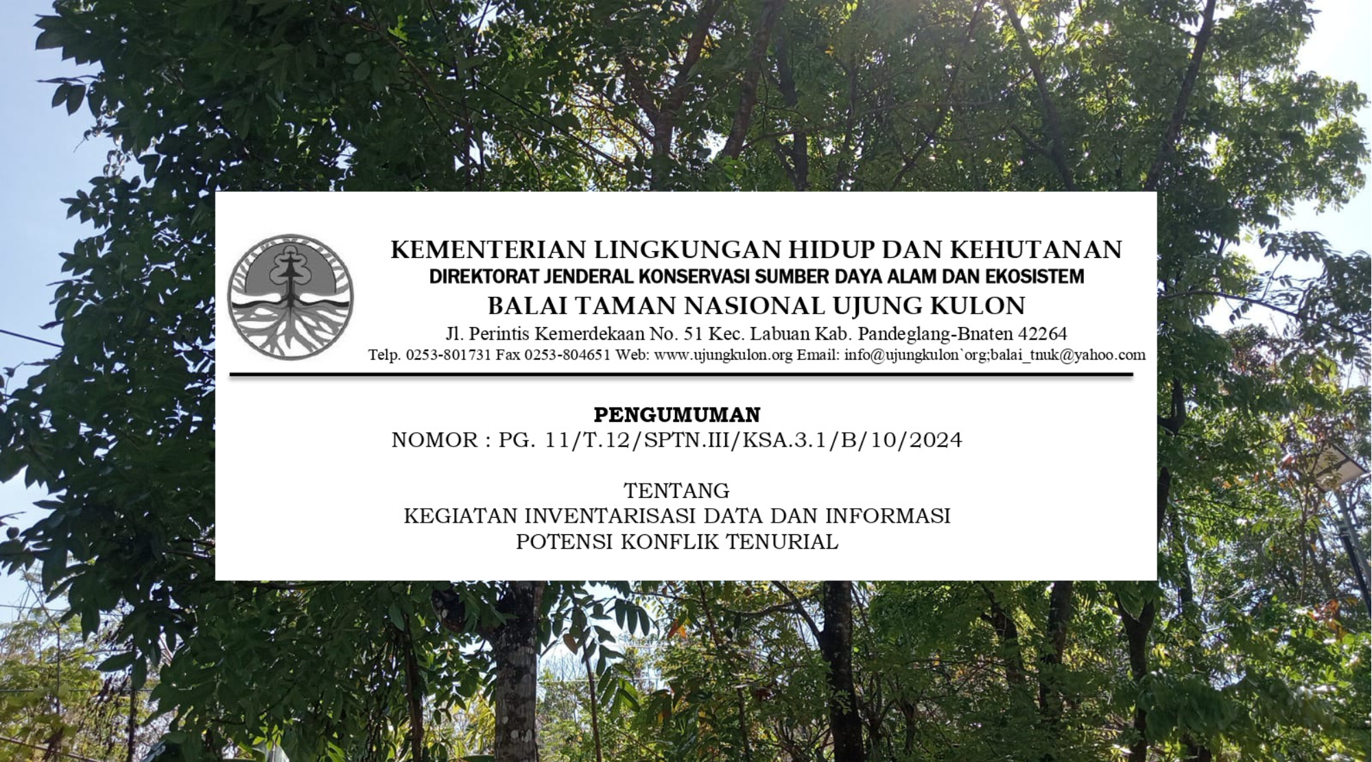 Sehubungan dengan hal tersebut diatas, pada bulan November 2024 kami akan melaksanakan kegiatan Inventarisasi Data dan Informasi Potensi Konflik Tenurial dalam rangka memperoleh data dan informasi aktivitas pertanian dan permukiman di dalam kawasan TNUK dengan tujuan mencegah konflik di kemudian hari. Yuk kita sama sama dukung kegiatan tersebut, supaya herang caina beunang laukna.