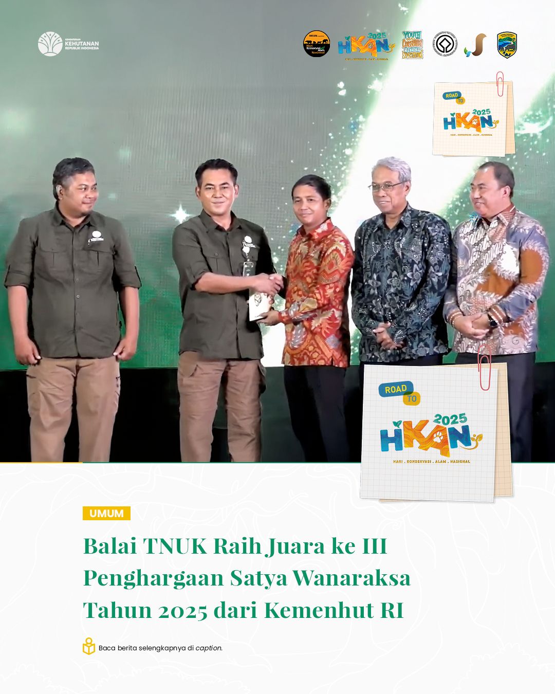 Balai Taman Nasional Ujung Kulon (TNUK) meraih Juara III dalam ajang Penghargaan Satya Wanaraksa 2025 dari Kementerian Kehutanan RI yang digelar pada 7 Agustus 2025. Penghargaan ini diberikan atas dedikasi luar biasa dalam perlindungan dan pengamanan kawasan konservasi, khususnya dalam menghadapi kasus perburuan ilegal Badak Jawa.